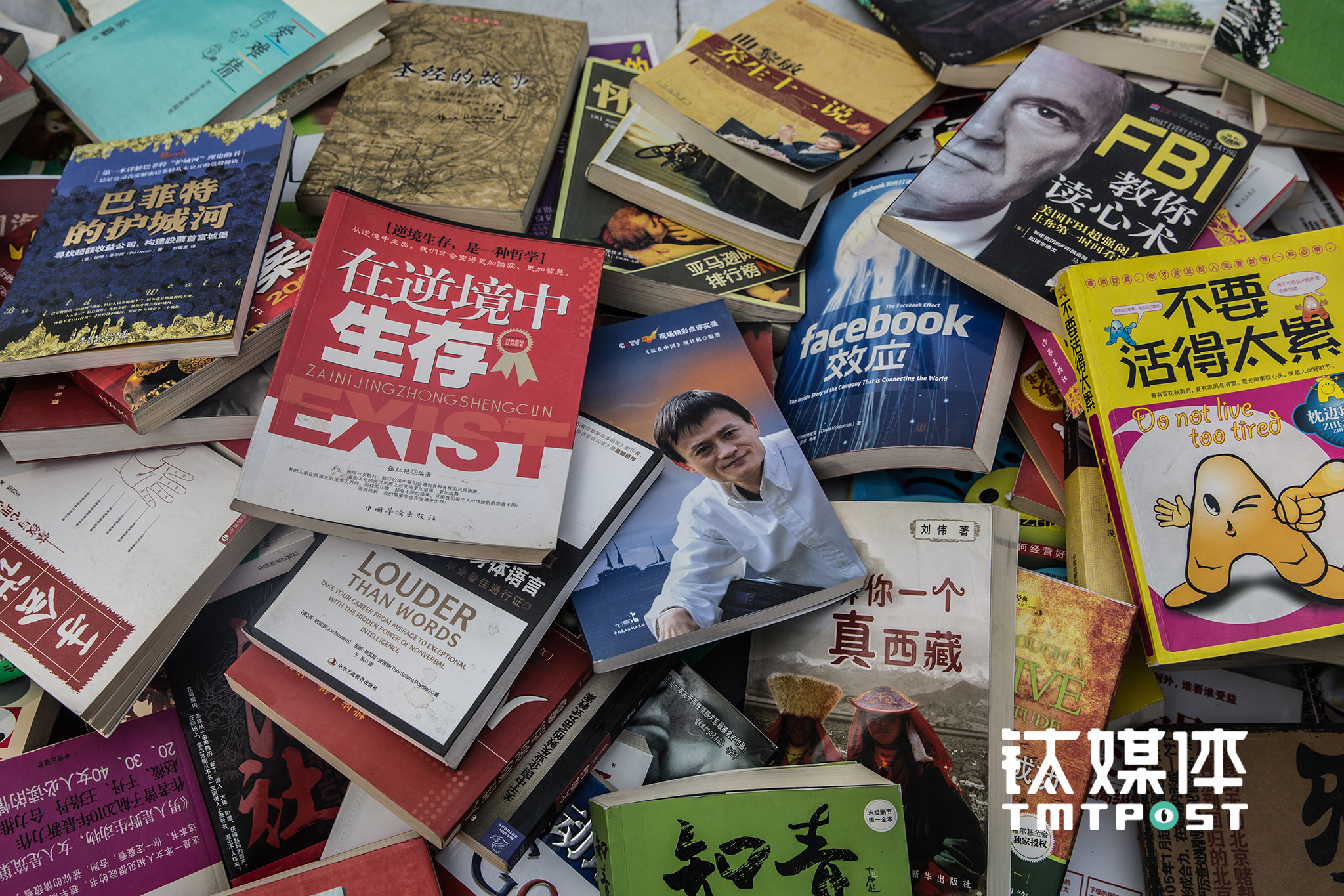 摊贩在街头书摊上兜售着的成功学、商业理论、心灵鸡汤的书籍。