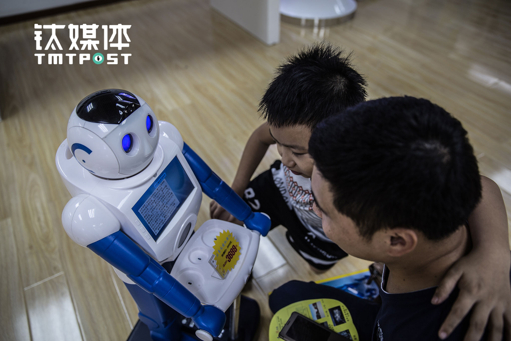 这里依然是很多国人心目中的高科技圣地。2016年7月25日,一对父子慕名来到中关村一家机器人创客空间参观,并与现场的机器人互动。