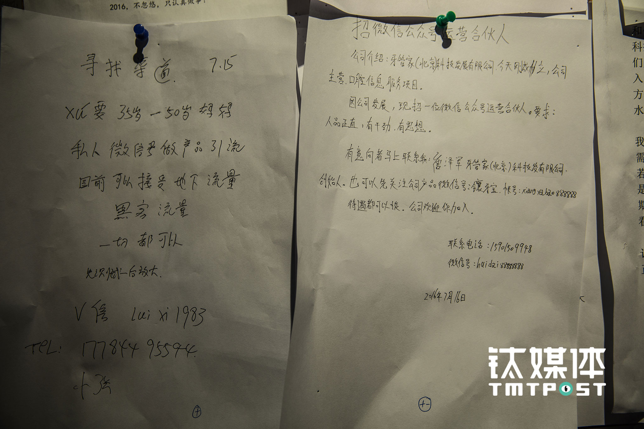 在这一带咖啡馆的墙上,出现得最多的是各种“招募合伙人、高手、找投资”的帖子,并且每天都有新的信息出现。