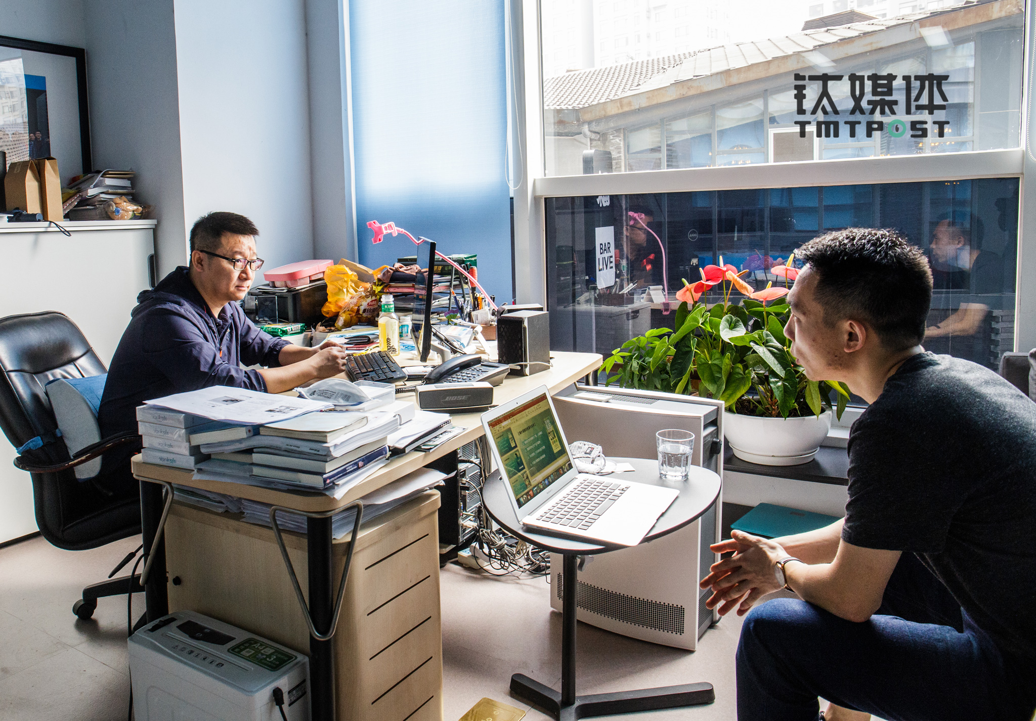 CEO耿乐(左)在办公室接受采访。2000年,耿乐在自己的卧室中创立了中国第一家同性恋网站——“淡蓝网”。当时身为一名警察,他对家人和同事隐瞒着自己的性取向,“我曾经一度觉得,自己是世界上唯一的同性恋。”