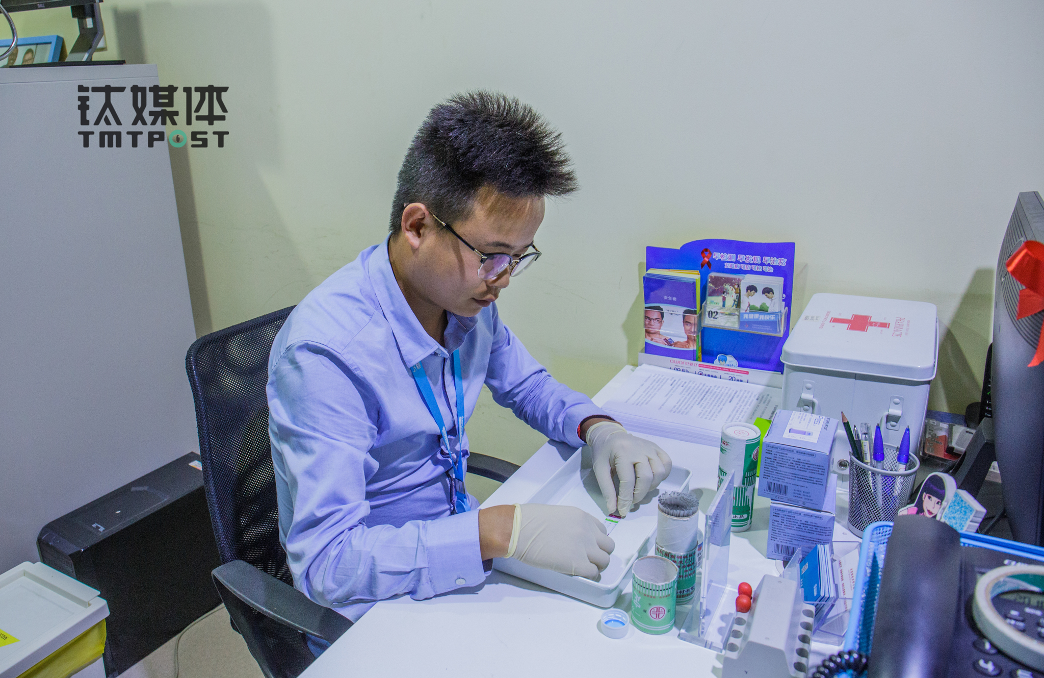 Blued与北京疾控中心等机构成立的HIV检测咨询室,HIV阳性心理关怀室里,Blued员工跃跃(化名)为一名到访者进行HIV检测。“一条红线就是阴性结果,说明他未感染。在并发症之前检出HIV,只要坚持抗病毒治疗,寿命和普通人是一样的,如果有了同性伴侣,就建议每三个月检测一次。”跃跃介绍,这里今年已检测了7000多人,“从检测室走出去的人,阴性的都如释重负,阳性的神色凝重,尤其是那些还不到20岁的大学生。很多感染者都不知道如何应对,所以我们还要对他们进行心理关怀,并联系疾控中心进行下一步治疗。”