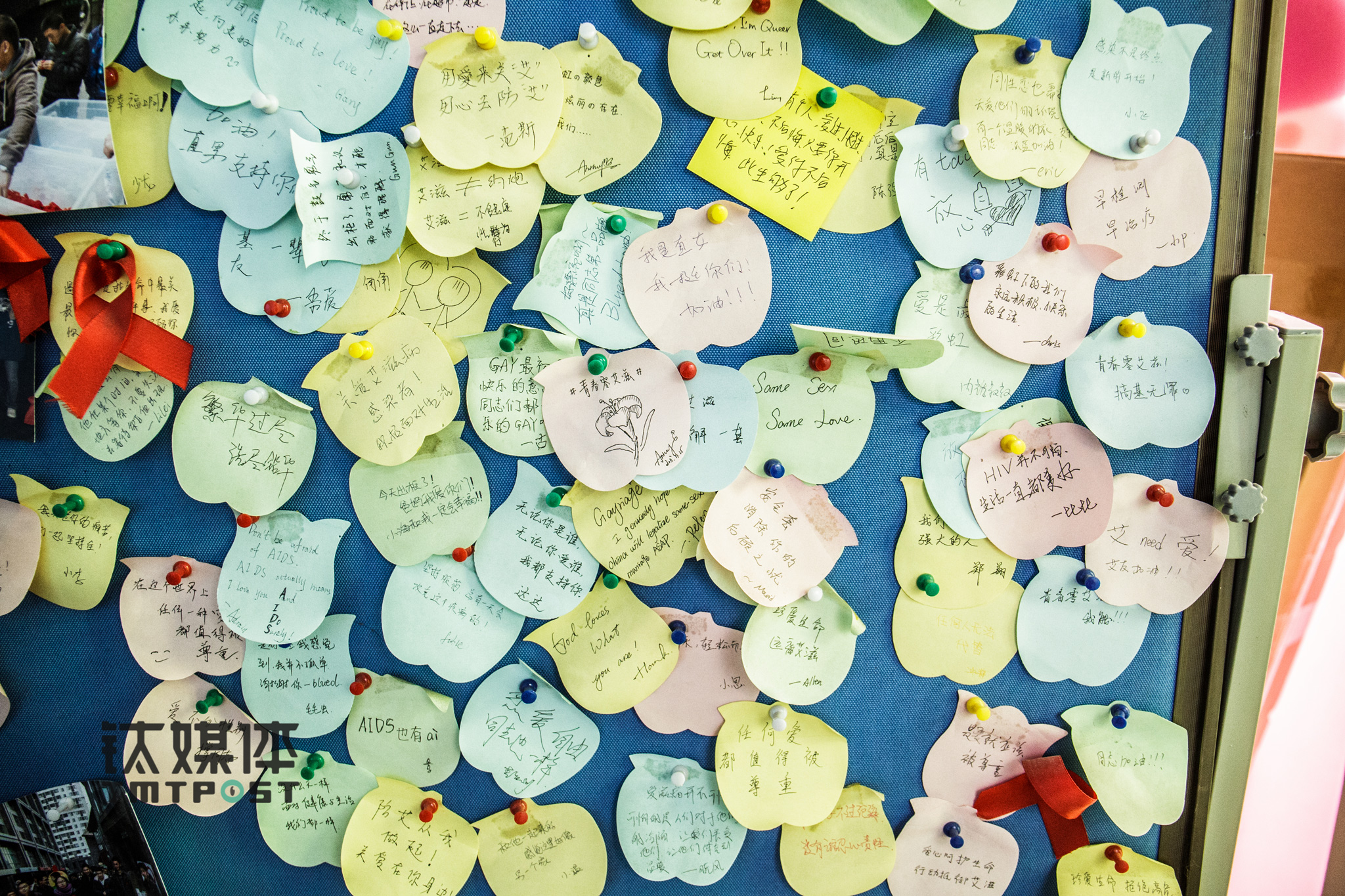 “艾滋不等于约炮,艾滋只是不健康”、“积极面对艾滋,热爱生活”、“今天出柜了,感谢父母”、“早检测,早治疗”………检测室门口的背板上,一些用户用便条纸写下的话。