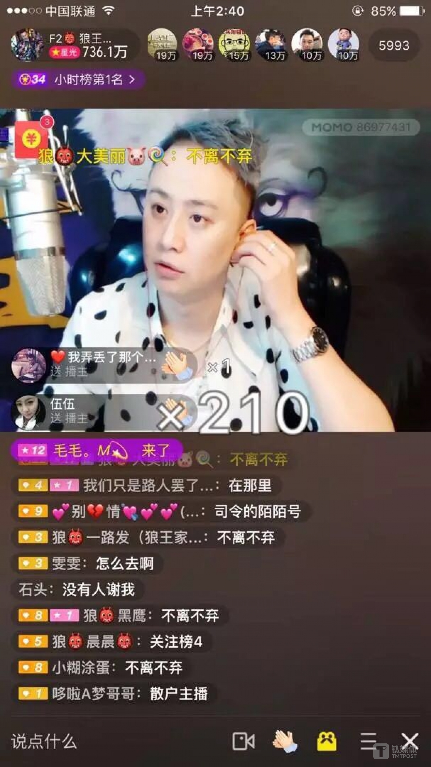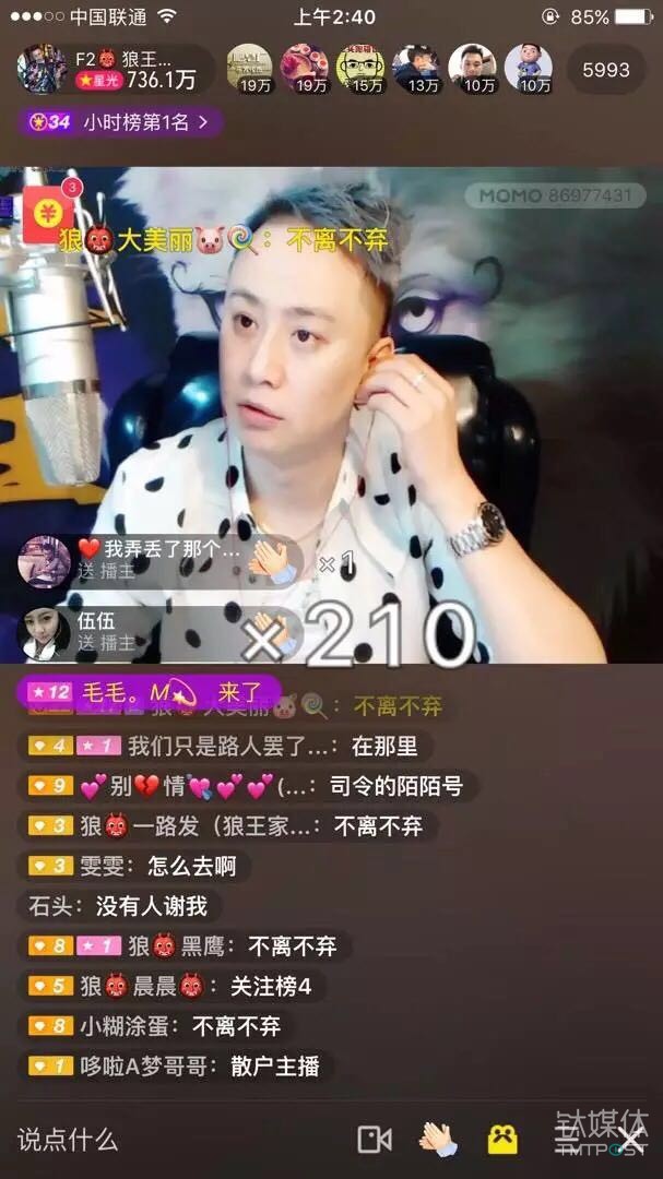 陈勇芝的一颗定心丸是陌陌的财报依旧好看。根据陌陌此前公布的2016年全年未经审计的财报,直播已经占据了其公司总营收68%以上,市值也开始稳定在70多亿美金。这是“念旧且固执”的琴岛人唯一合作的直播平台。