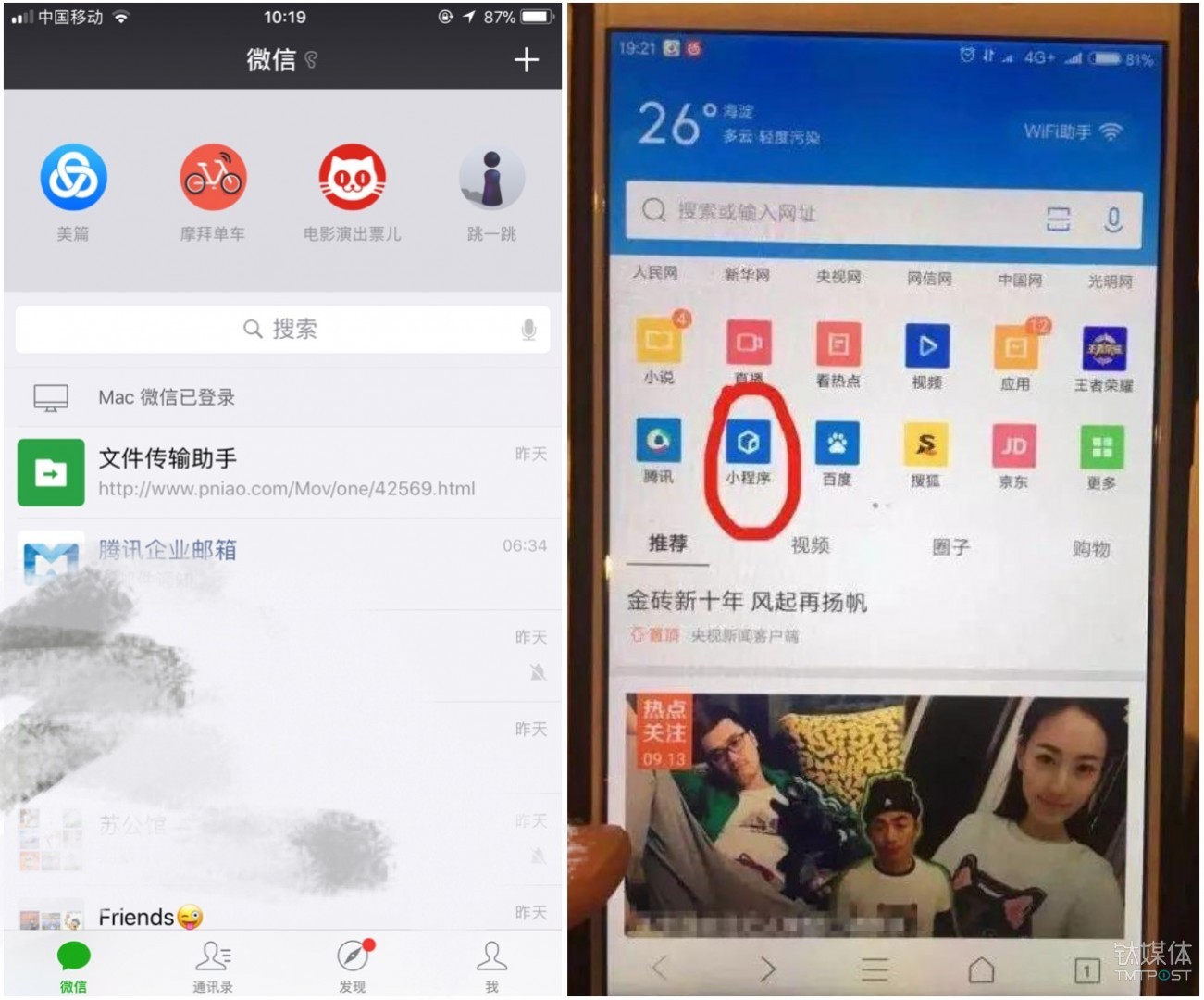 另外,在QQ浏览器最新发布的安卓8.1版本中,其搜索栏也新增了专供微信小程序的搜索入口(上图左)。