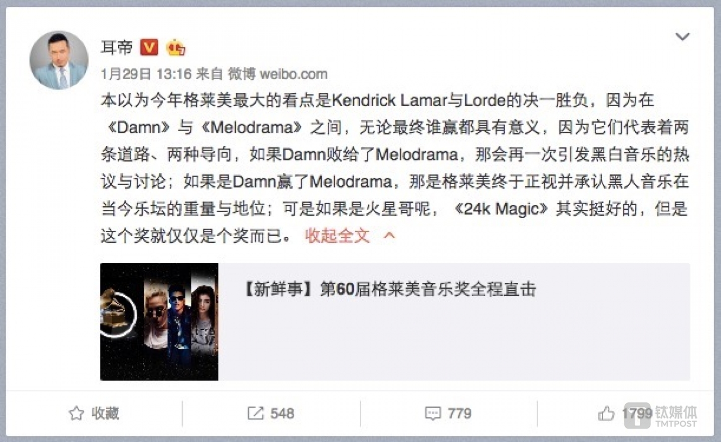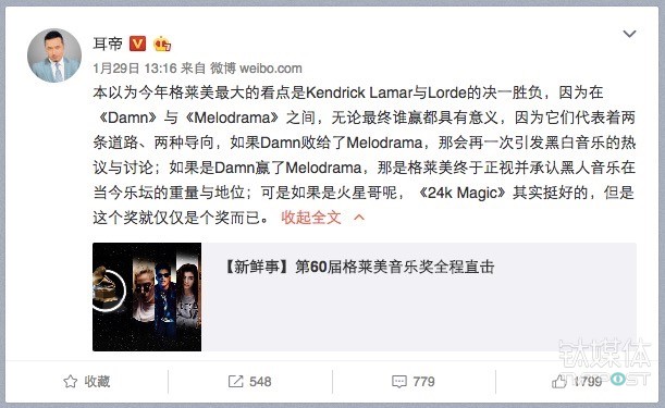 知名音乐博主耳帝评价今年的格莱美