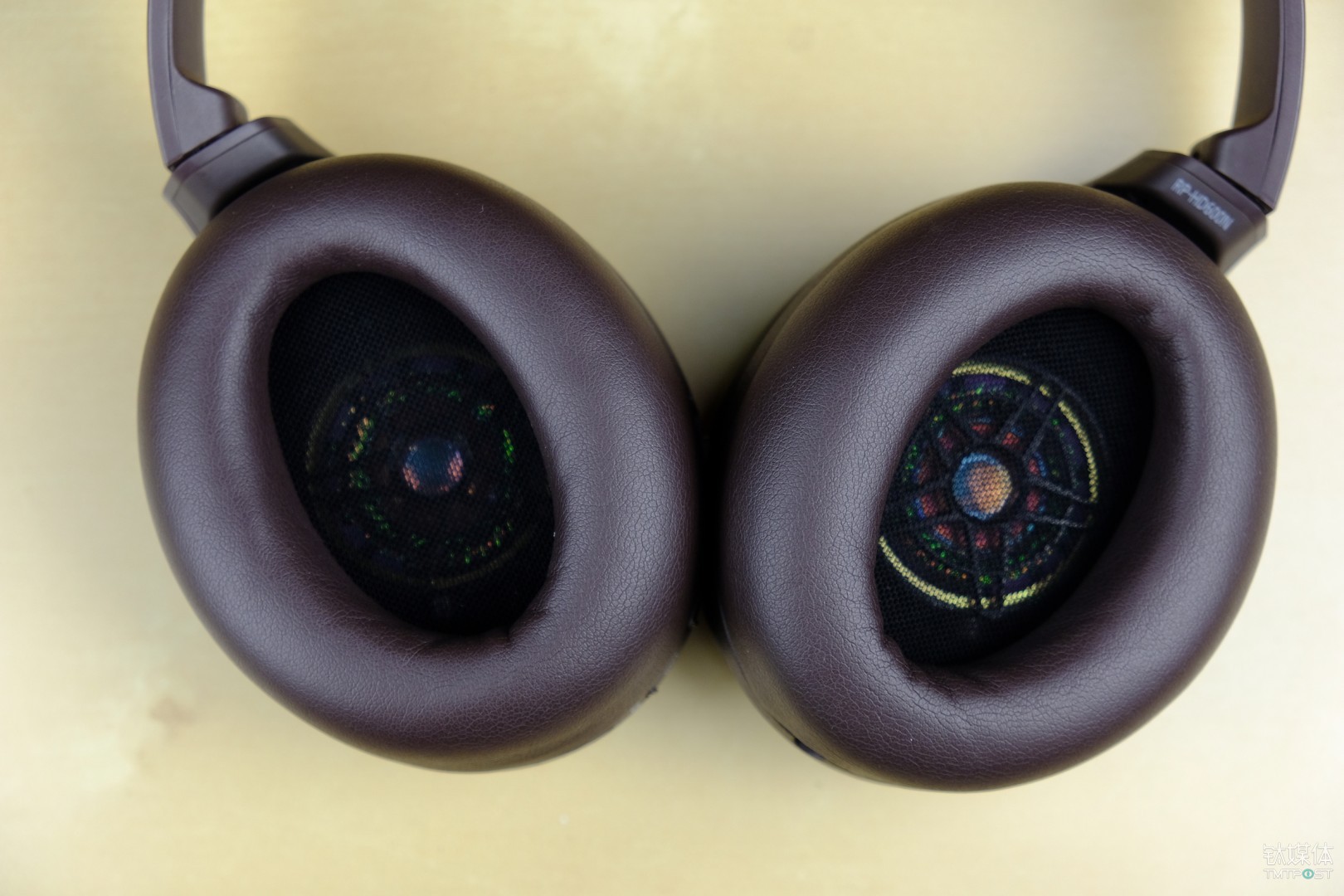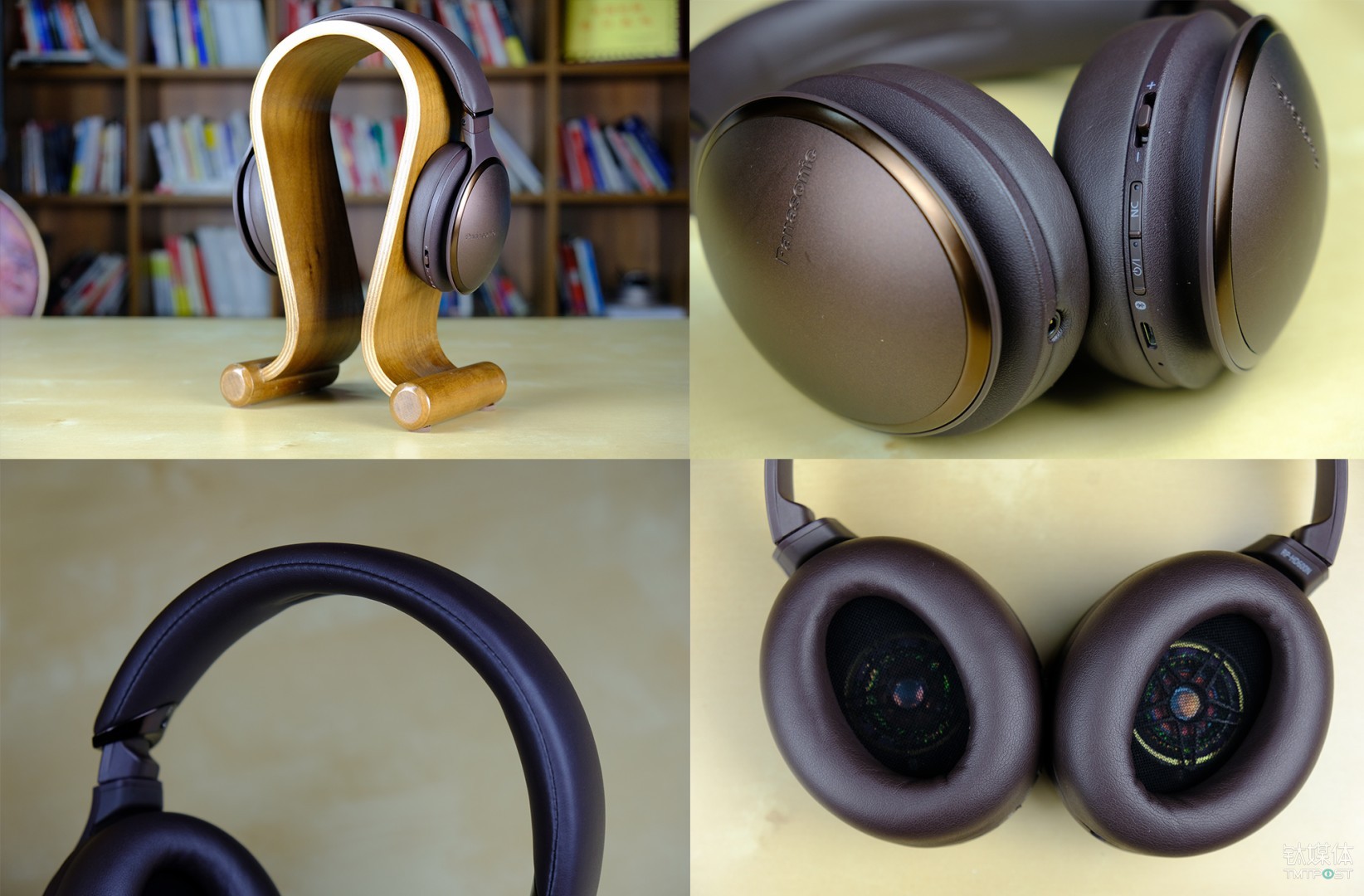 说完最抓人眼球的,接下来就是最不起眼的:Panasonic RP-HD605N。这款产品的两种配色都是深色调——深棕色和黑色。笔者手上的这款是深棕色,品牌 Logo 以阴刻的方式印在耳机侧面,如果不仔细看,甚至都不会注意到其品牌。棕色机身与皮质的横梁,耳罩给人一种整体都是皮革的错觉,但耳罩内部分使用的是薄而疏的纱网,耳机喇叭近乎完全裸露在用户视野里,显得比较廉价感。