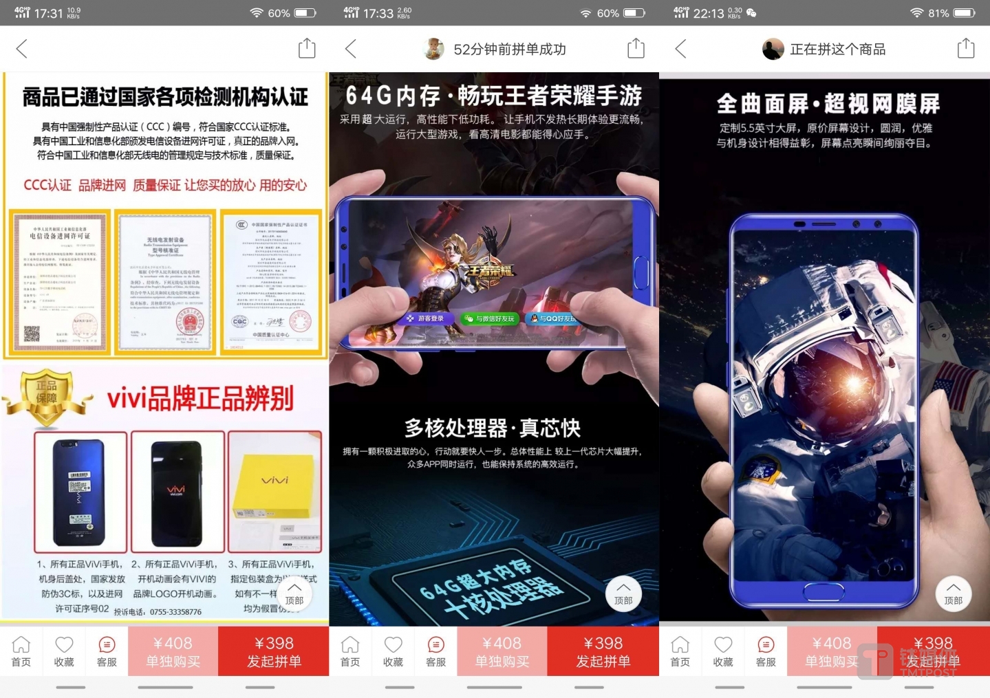 以上三件产品,均是钛媒体在拼多多上选购的爆款产品,都在APP首页相关品类的重要推荐位置上。总结下来,它们身上的共性就是,虚假的广告宣传和劣质无保障的山寨品。