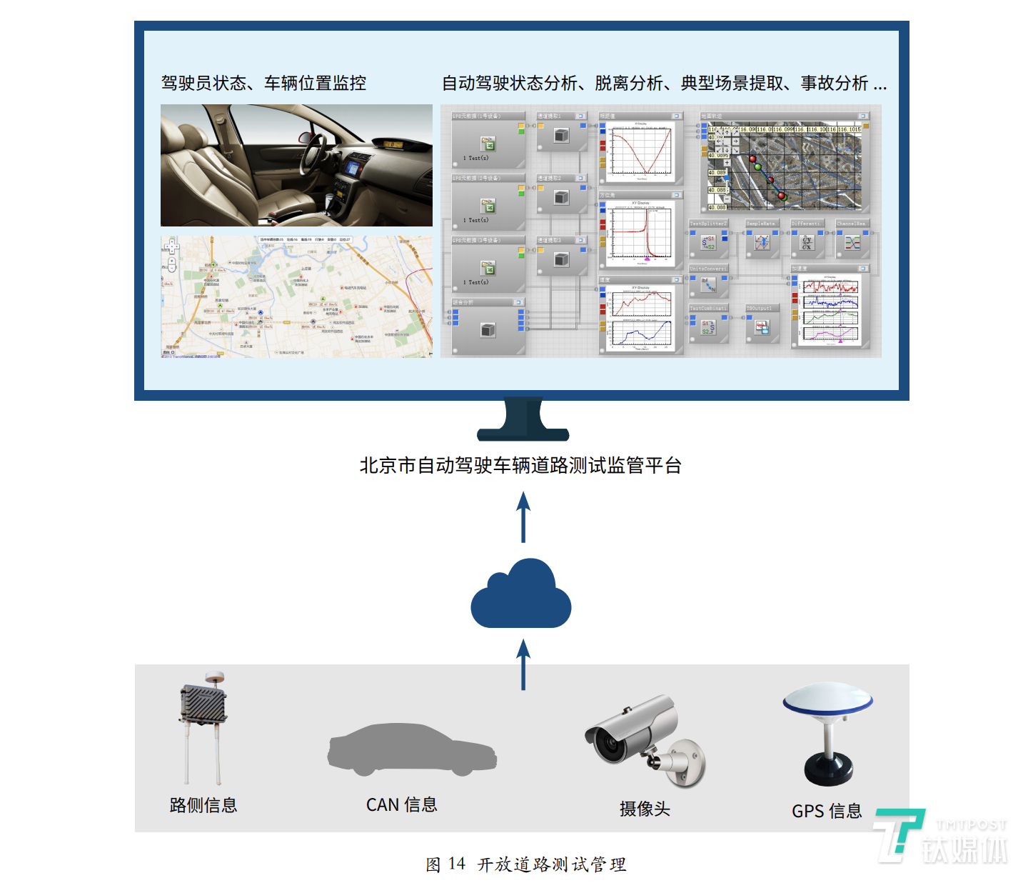 在公开道路测试中,北京市也对车辆的安全测试进行了严格监管,包括要求自动驾驶车辆应安装监管装置,接受第三方机构日常监管。而为保证测试安全可控,示范区研制了“北京市自动驾驶车辆道路测试监管平台”,实时监管车辆的位置、自动驾驶状态及车况、测试驾驶员行为等。