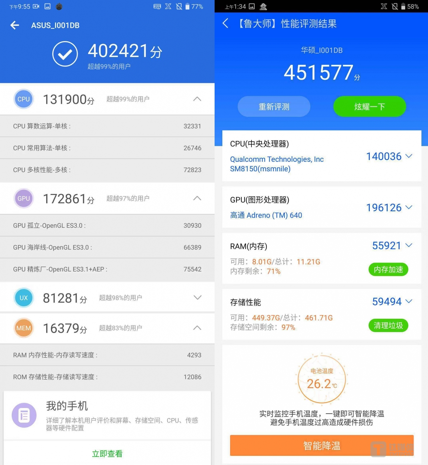 与上一代相比,ROG游戏手机2在安兔兔效能测试中性能提升35%,得分达到目前最高的40.2万,而在鲁大师测试中,其也得到了45.1万的好成绩。
