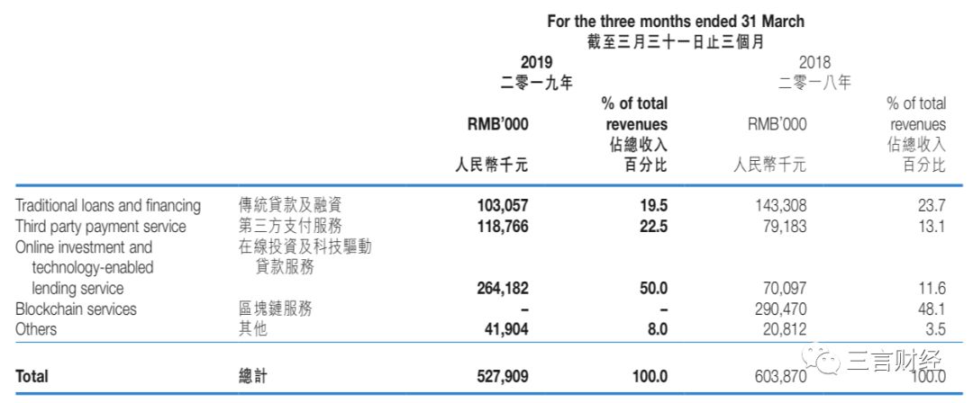 在中新控股停牌前发布的最后一份财报中,区块链业务收入直接显示为“无”。2019年第一季度,财富管理业务收入占比50%、第三方支付业务收入占比22.5%,传统贷款业务占比19.5%。