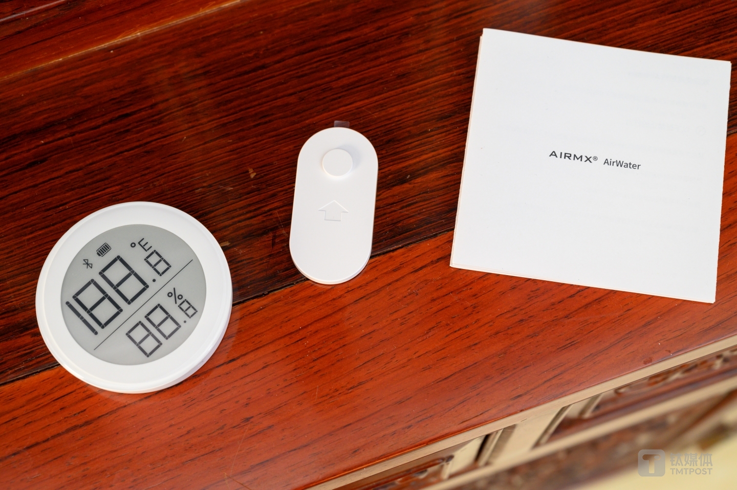 除了机内设置的湿度传感器,此次AirWater无污染加湿器还加入了一颗独立的温湿度传感器,采用圆形造型与低功耗的屏幕,用纽扣电池供电。在包装内还有一个小型的墙上底座,它的温湿度探测器位于底部,除了可以独立使用以外,这颗温湿度传感器也可以与主机进行联动,方便对屋内各个不同区域进行湿度控制,具体操作放到后面详细介绍。