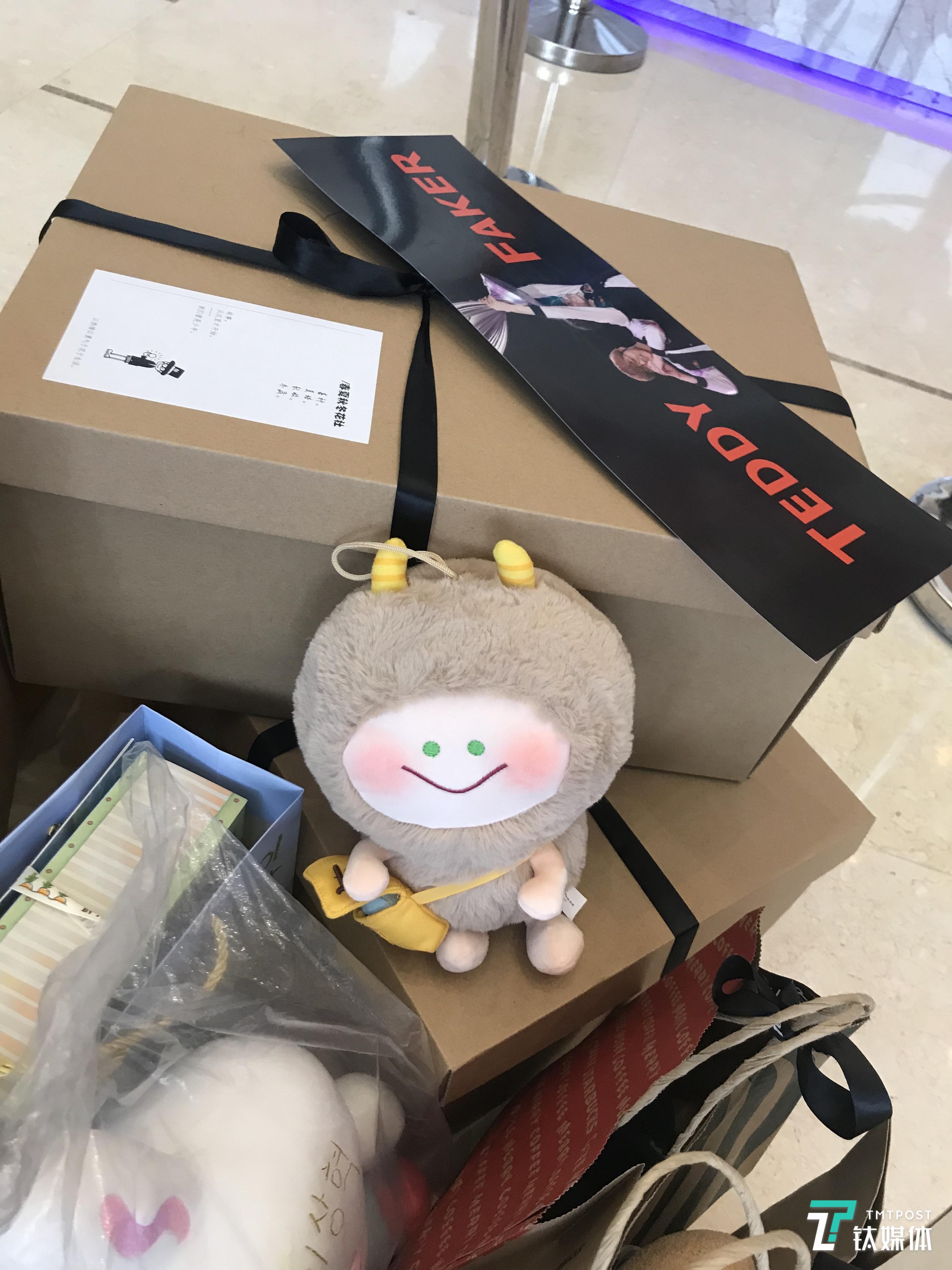 现场大部分粉丝都是女性,有奖问答和水友赛环节的幸运观众中都只有一名男性,她们扛着个单反相机拍照,跑起来速度并不比男性慢,要送给两位选手的礼物在电竞馆大厅中间堆成了一座小山。