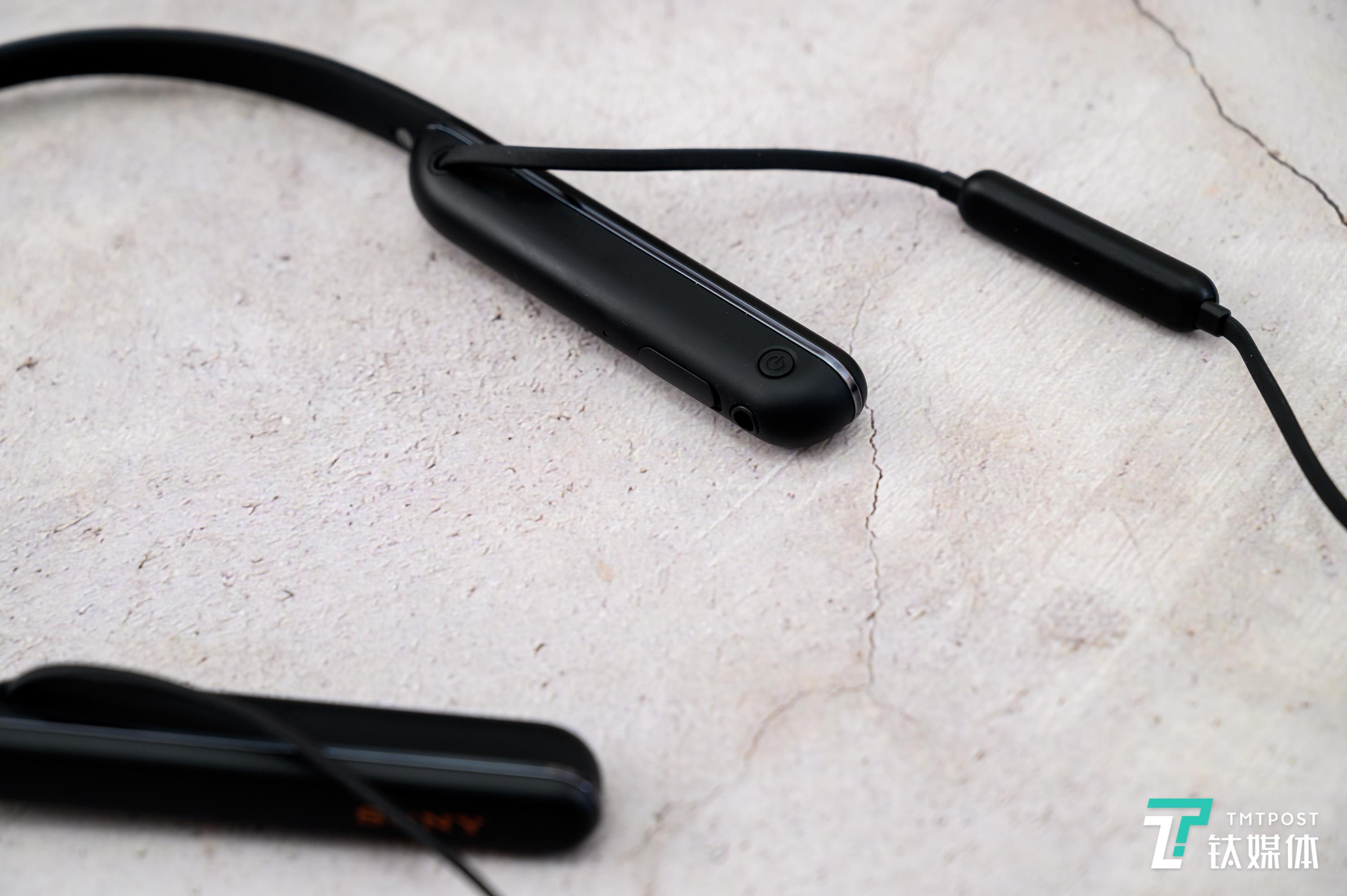 在机身的细节设计上有几点是比较值得注意的,首先是由一体化硬质改变为前半部分硬质,颈挂弯折部分软质的设计,这也是能够折叠收纳的前提,同时也提升了耳机的佩戴舒适度,挂在脖子上的时候可以更好地与颈部贴合。第二个则是独立麦克风/操控模块的加入,在颈部主机上仅保留了一颗电源按键。