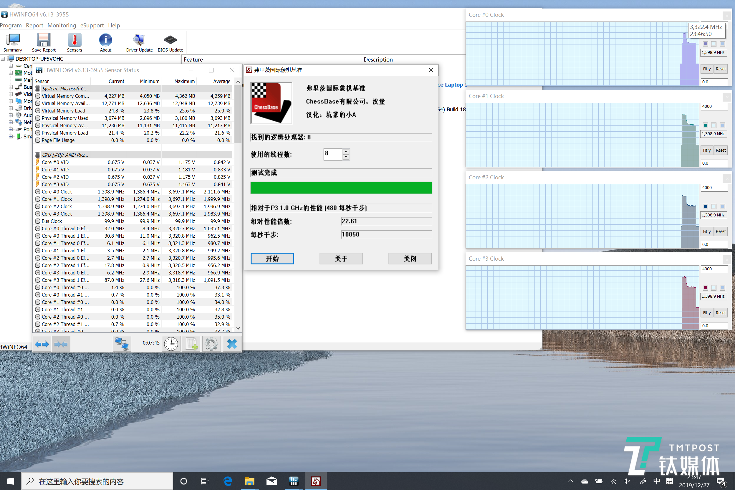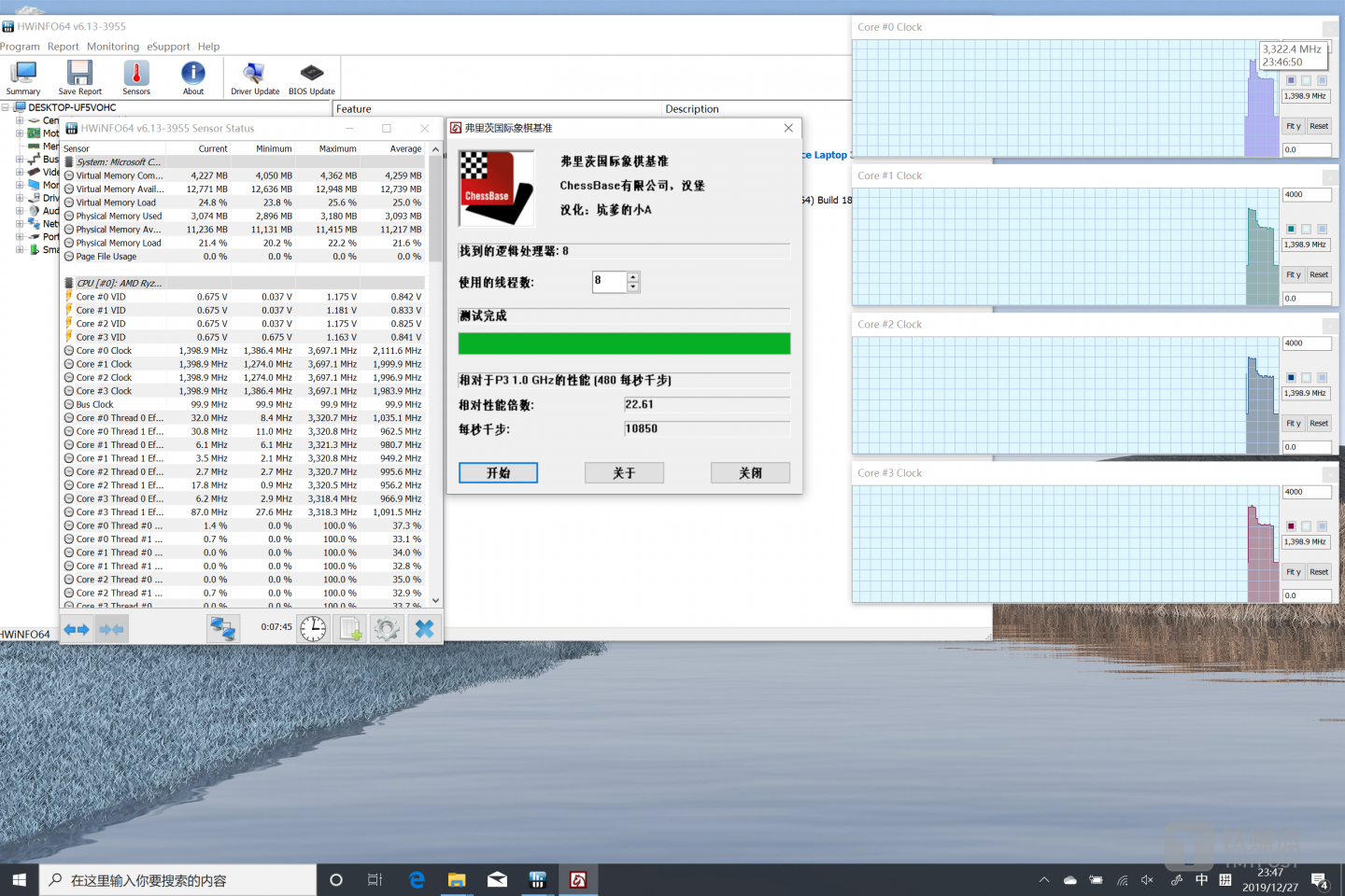 首先,这颗四核八线程的AMD处理器的性能确实也堪用,但在性能方面确实相较于同样档次的英特尔处理略有逊色。笔者选取了“Fritz Chess Benchmark 国际象棋”作为CPU性能测试: