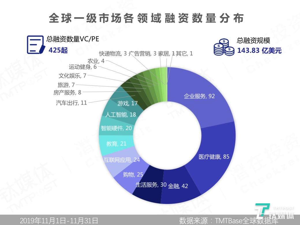 钛媒体旗下「潜在投资」给2019年11月做一个总结—— 全球融资数量425起,国内融资数量占比国外1/2;国内外大额融资频出,其中亿规模融资约51起,占比全球融资数量12%;融资轮次上看比较偏向早、后期;国外企业服务、医疗健康、金融领域持续火热。