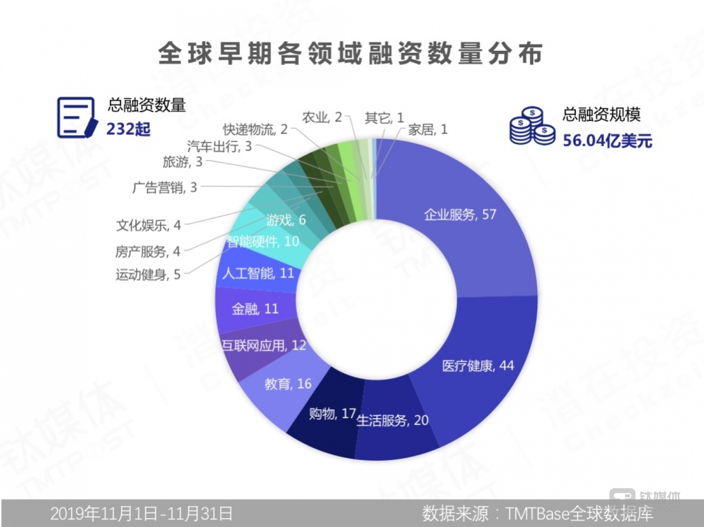 「潜在投资」将A+轮及A+轮之前的融资定义为“早期融资”。根据钛媒体TMTBASE全球数据库显示,2019年11月发生在早期阶段的VC/PE类融资事件共计约232起,融资规模约为56.04亿美元,折合人民币约391.35亿元 (国外项目共16.46亿美元,国内39.58亿美元)。