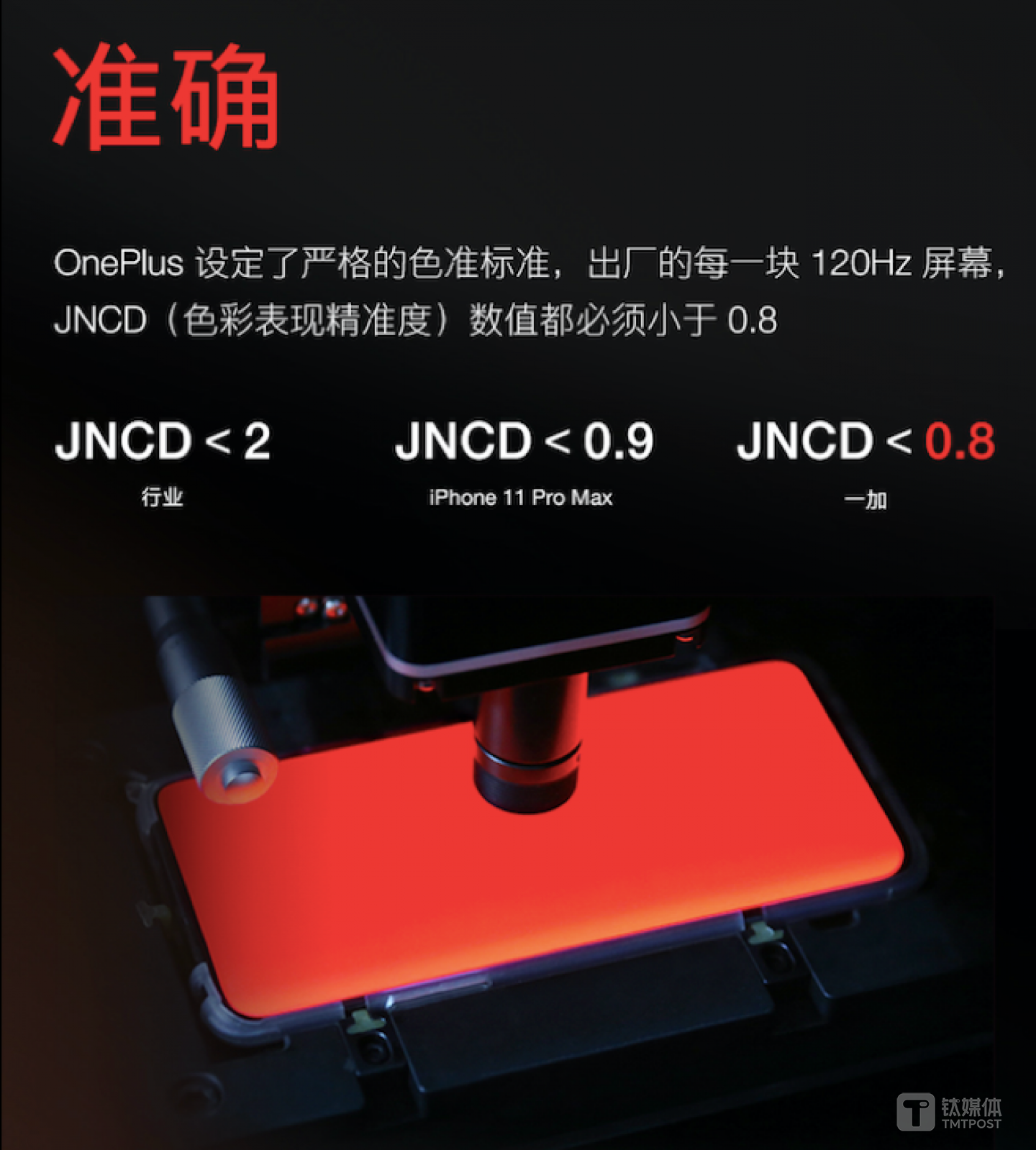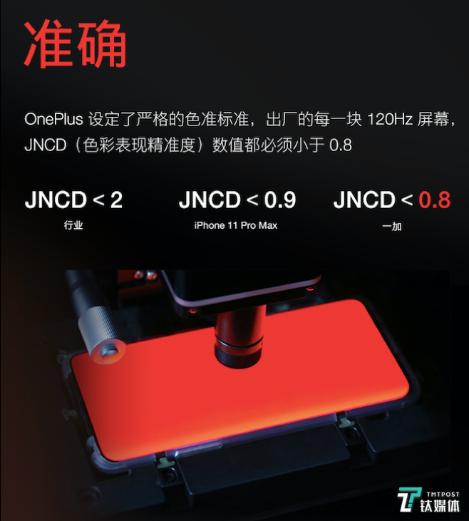 衡量色准的客观数据当中,有一个被称为JNCD<X,它的数值越小代表色准越准。一般来说,JNCD<2就可以说是高标准了。一加这块屏幕的色准控制在JNCD<0.8,作为对比,iPhone 11 Pro Max的JNCD<0.9,并且,一加的JNCD<0.8是全系产品的出厂标准,这一点对用户来说可谓是诚意满满。
