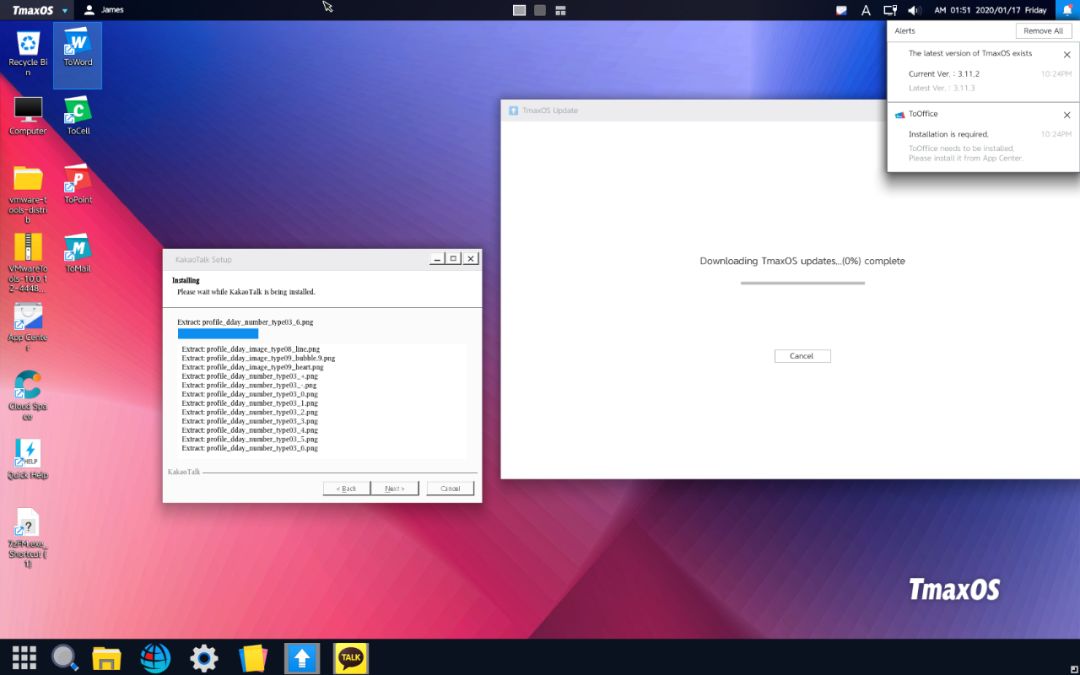 在这个照片中,展出了一些可以在 TmaxOS 上运行的应用,包括韩国版微信 KakaoTalk,以及自己开发的浏览器 ToGate,还有三个办公套件。