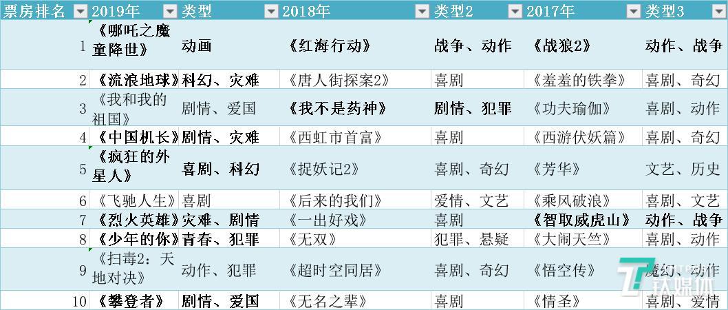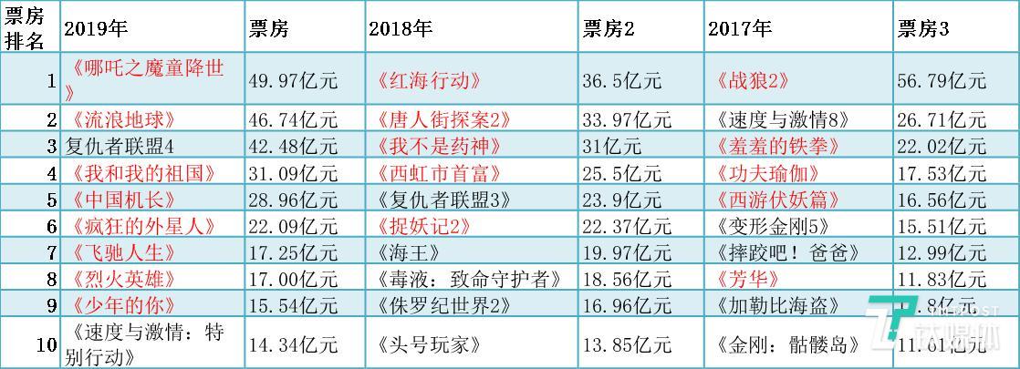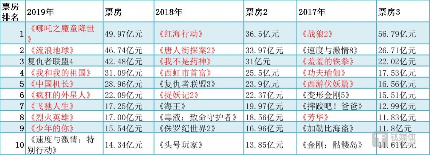 2017年-2019年内地电影票房前十 ,红字为国产影片