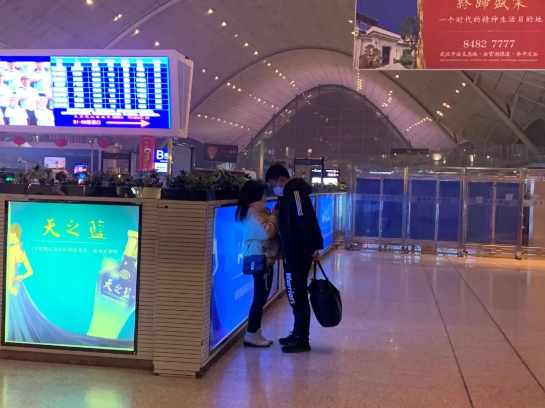武汉站内的一对情侣,摄于1月21日
