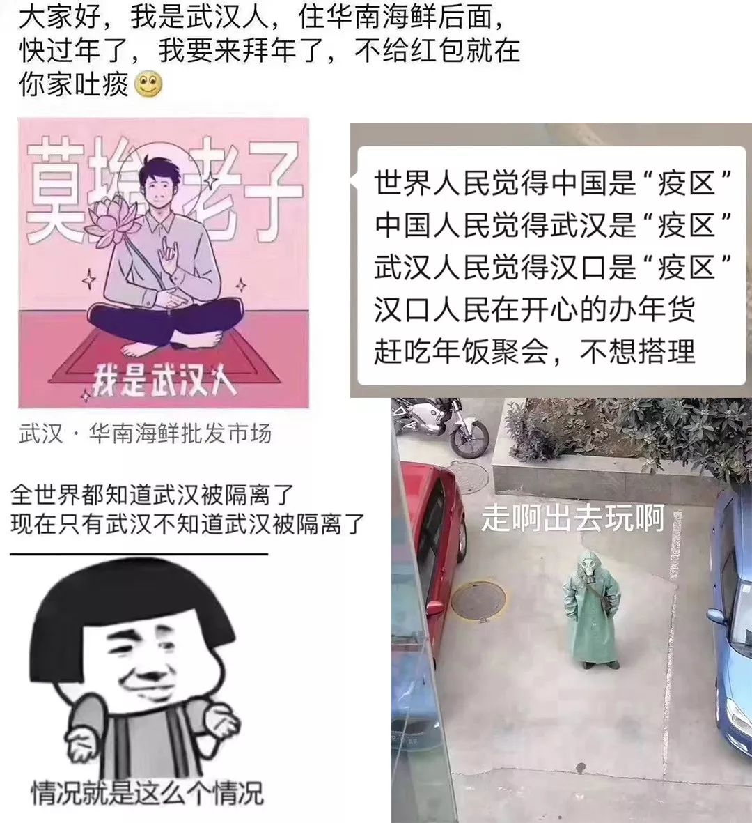 但让我意想不到的是,这一天里,朋友圈全是“全国都在担心武汉,可是武汉人连口罩都不带”、“我是武汉人,莫埃老子”、“全国每年交通事故死多少人?非典死多少人?平均每个人病毒致命的危险系数远小于你每天开车出门!”等等充满了武汉特色“不服周”气息的表情包。