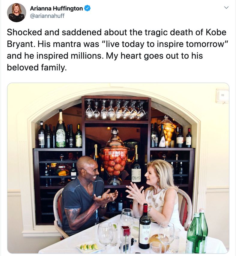 在科比突发坠机后,阿里安娜·赫芬顿(Arianna Huffington)第一时间在社交媒体上公开表达哀思和震惊,并称赞科比曾经身体力行,激励启迪了很多人。