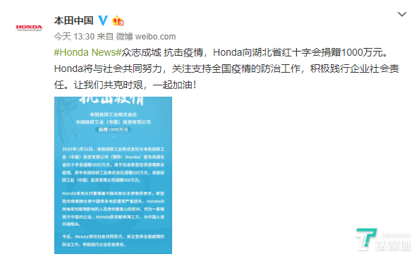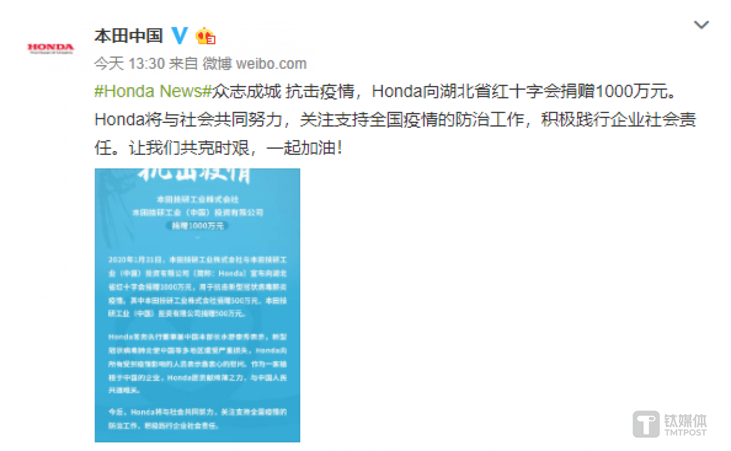 1月31日,本田技研工业株式会社与本田技研工业(中国)投资有限公司,宣布向湖北红十字会捐赠1000万元,用于抗击新型冠状病毒肺炎疫情。其中本田技研工业株式会社捐赠500万,本田技研工业(中国)投资有限公司捐赠500万元。