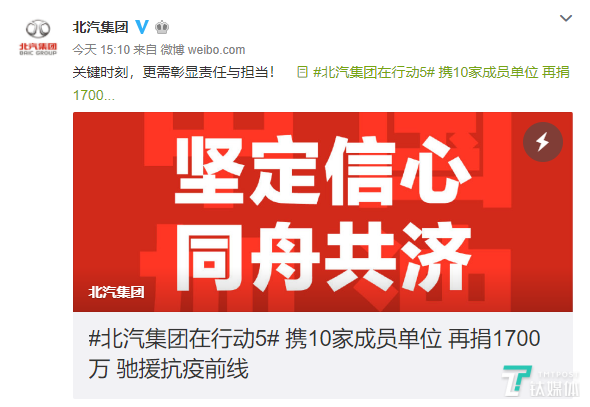 2月2日,北汽集团宣布联合旗下10家单位(北京汽车、北京越野、北汽新能源、北汽福田、北汽昌河、福建奔驰、海纳川、北汽鹏龙、北汽产投、北汽财务)。为支持疫情防控共同捐款1700万元。这是继旗下北京奔驰捐赠1000万元、北京现代携手现代汽车捐赠1500万元、北现金融捐赠100万元之后,北汽集团的追加捐资。