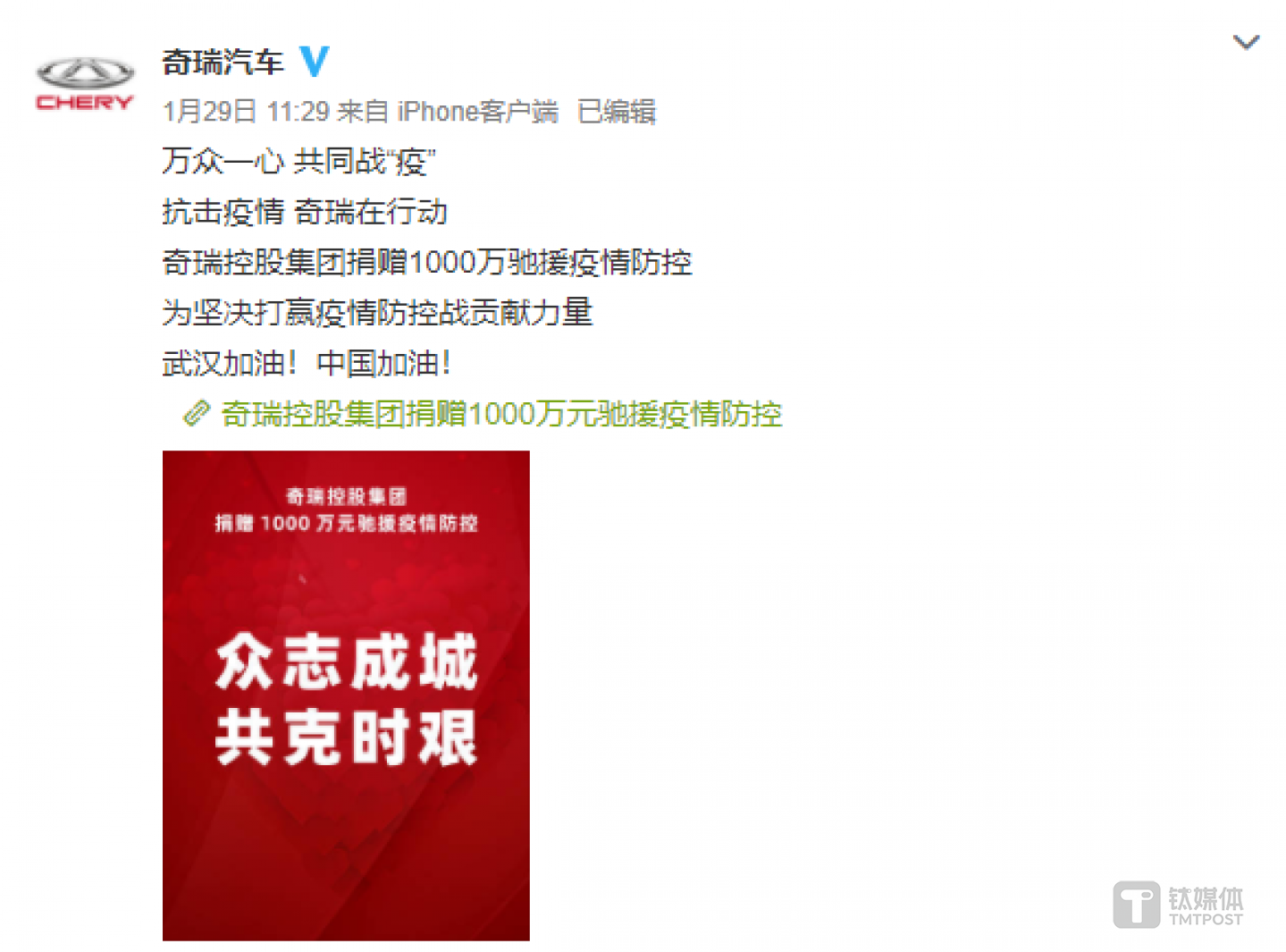 1月29日,奇瑞控股集团捐赠1000万元,包括提供现金、专用救护车辆,以及医用防护口罩、防护服、护目镜等医疗防护物资,主要用于支援湖北等疫情较重的地区。