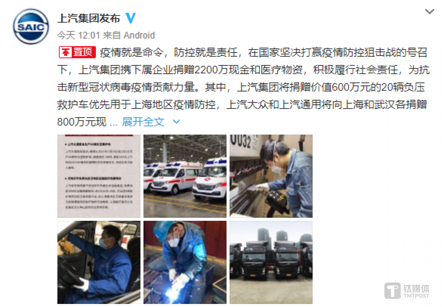 1月31日,上汽集团携下属企业捐赠2200万现金和医疗物资,其中上汽集团将捐赠价值600万元的20辆负压救护车优先用于上海地区疫情防控,上汽大众通过上海慈善机构捐赠800万元,上汽通用向武汉市捐赠800万元。