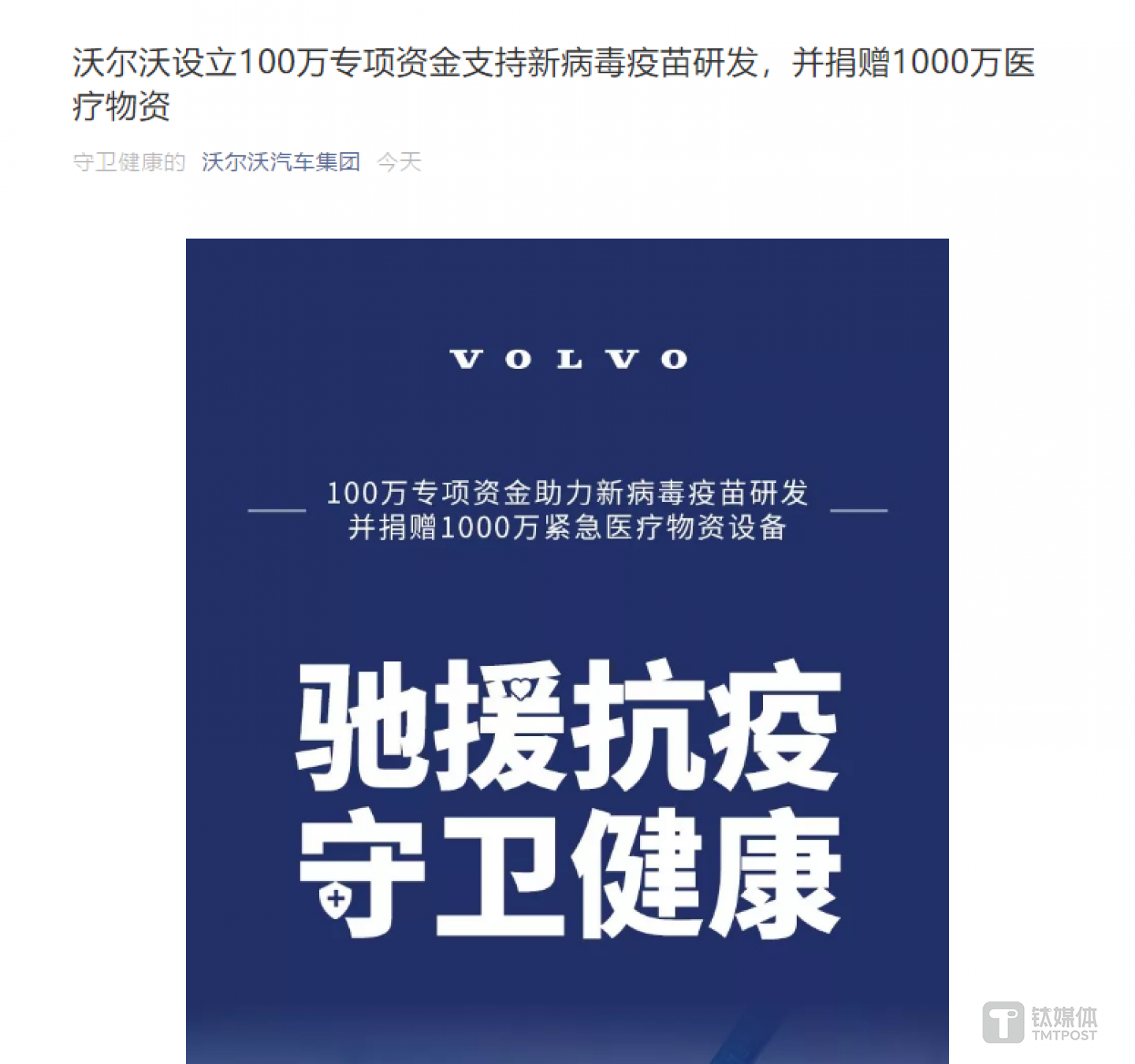 沃尔沃设立100万专项资金支持新病毒疫苗研发,并捐赠1000万医疗物资