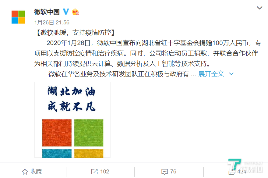 1月26日,微软中国宣布向湖北省红十字基金会捐赠100万人民币,专项用以支援防控疫情和治疗疾病。同时,公司将启动员工捐款,并联合合作伙伴为相关部门持续提供云计算、数据分析及人工智能等技术支持。