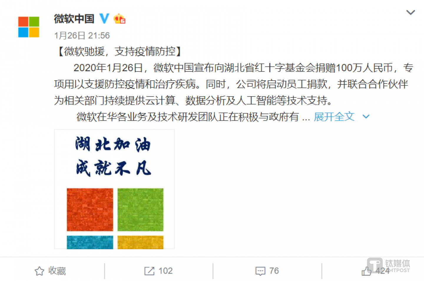 微软:捐赠100万元