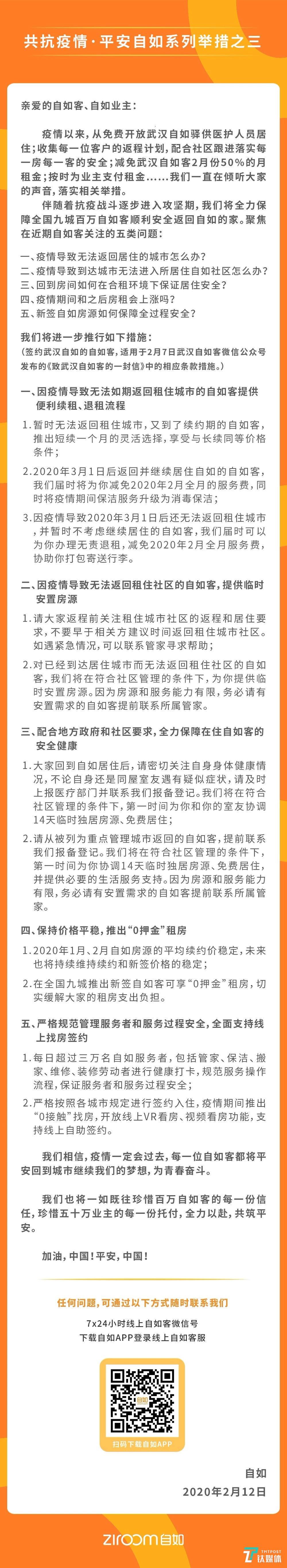 2月12日,自如发布了新公告《共抗疫情·平安自如 系列举措之三》,就近期租客和业主核心关注的房租是否会波动,因疫情影响无法返回租住城市或社区怎么办、如何保障合租环境安全等五方面问题分别进行了回应。同时,宣布推出针对疫情的进一步系列举措,包括为符合相应条件的租客提供短续优惠、服务费减免、无责退租、临时安置房源、新签“0押金”等。