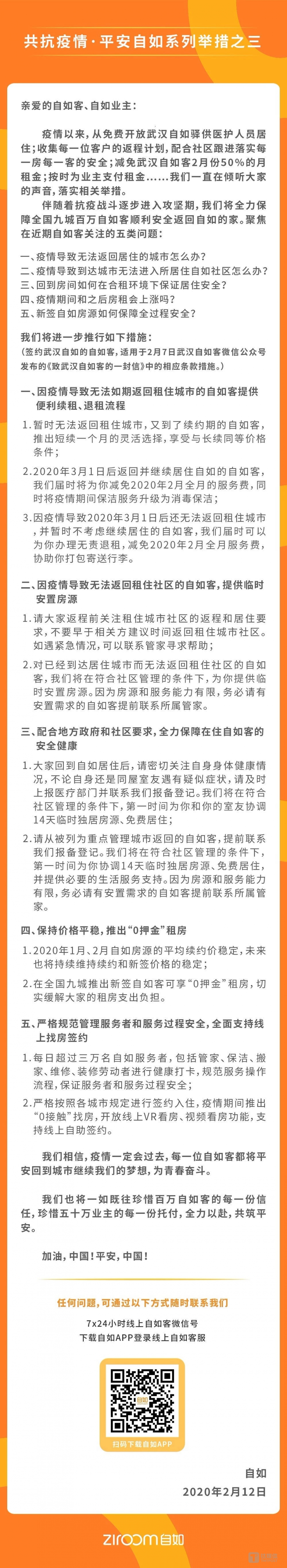 此前,自如已陆续发布多项针对疫情的应对举措,包括2月7日,武汉自如发出《致武汉自如客的一封信》,宣布减免武汉自如客2月50%的租金及2月全月服务费等措施;开放武汉自如驿供医护人员居住,配合社区防控、协助相关政府部门收集租客返程信息,按时为业主支付租金等。