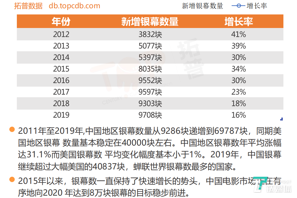 2019年,尽管内地总票房642.66亿元,同比增长5.4%;但观影人次17.27亿,同比只增长了0.64%。据拓普数据显示,2019年全国影院超过万家,全国银幕总数达到69787块,新增银幕9708块,增幅超16%。并且今年我国的银幕数还将向8万块的目标进发。