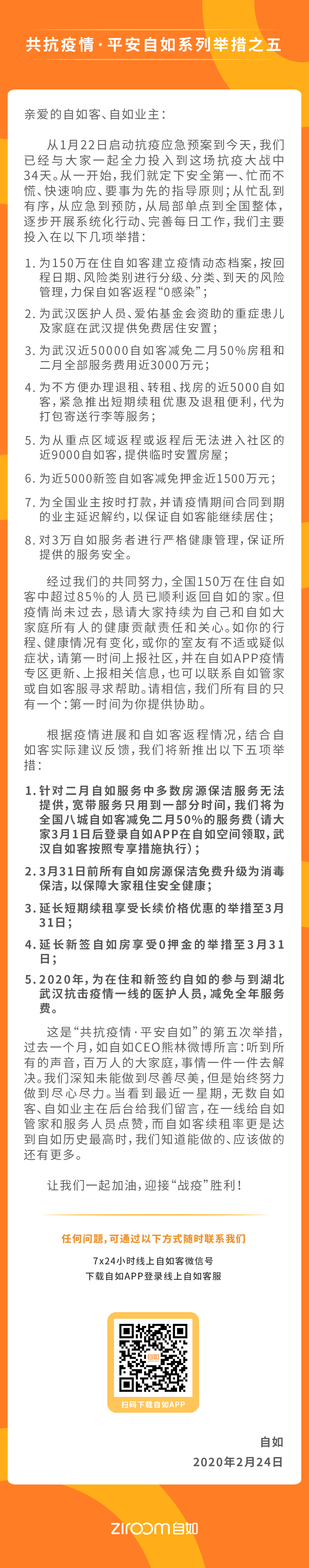 根据目前疫情进展和租客返程情况,结合自如租客实际建议和反馈,自如在此次新公布的“举措五”中,再次推出五项升级措施: