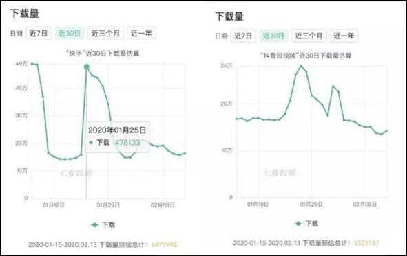据七麦数据显示,近一个月,快手、抖音下载量分别超过697万、532万。