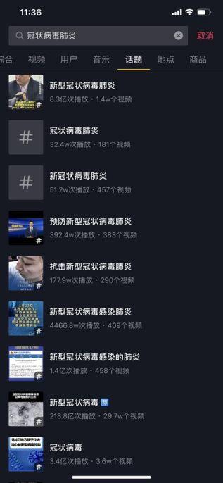 截止到2月14日,在抖音上搜素输入“冠状病毒肺炎”,结果出现了上百个相关话题。其中,仅关键词“新型冠状病毒”的视频就多达218亿次的播放,29.7万个视频;“新型冠状病毒肺炎”话题达到了8.3亿次播放,1.4w个视频等。