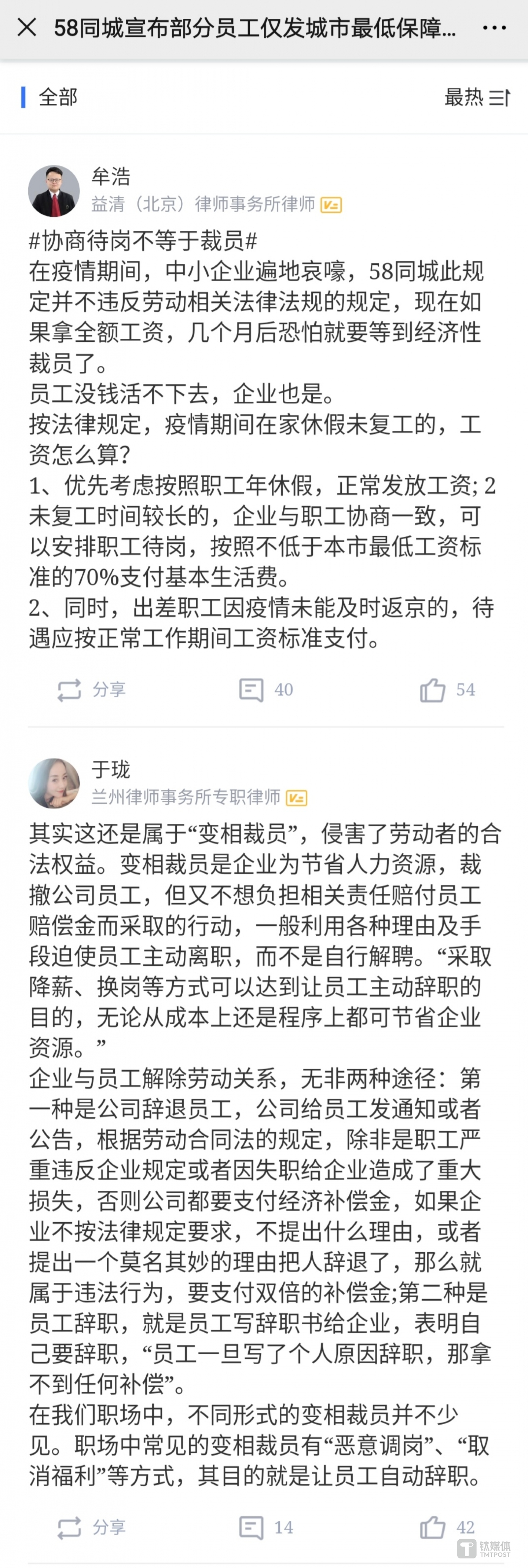 在热门评论区,有认证的益清(北京)律师事务所律师表示,协商待岗不等于裁员。他认为,“在疫情期间,中小企业遍地哀嚎,58同城此规定并不违反劳动相关法律法规的规定,现在如果拿全额工资,几个月后恐怕就要等到经济性裁员了。”