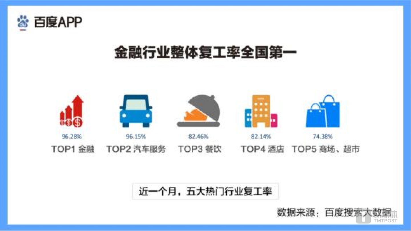 据百度统计的复工数据显示,以上五个行业复工率均超过七成,复工所需的生活服务基本得以满足。