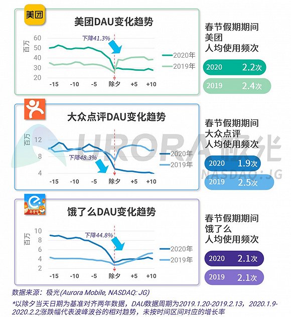 据极光大数据统计,以除夕为分割点,春节假期美团平台的日活用户数较除夕前下降41.3%,饿了么的日活下滑则更为严峻,下降44.8%。