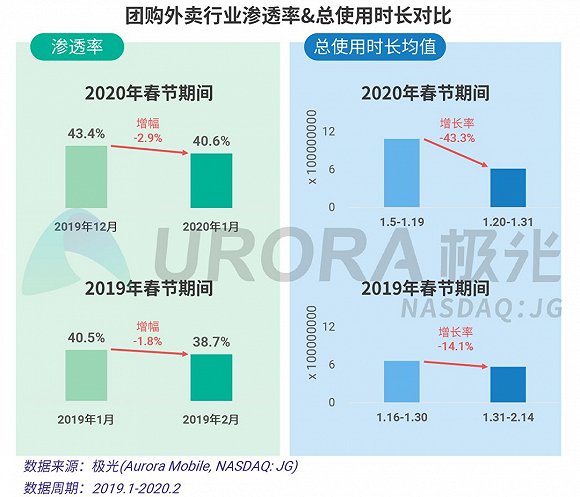 从渗透率上看,由于假期影响,每年1月份团购外卖均处于年度低谷,而2020年春节期间的总使用时长相比2019年下降更为显著。