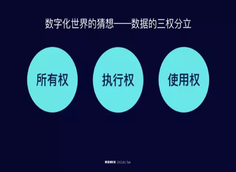 基于这样的命题,我们提出了一个猜想,借用了一个概念,把它叫做:数据的三权分立。包括数据所有权,以及相对应的使用权,另外,又引入一个新概念叫执行权。