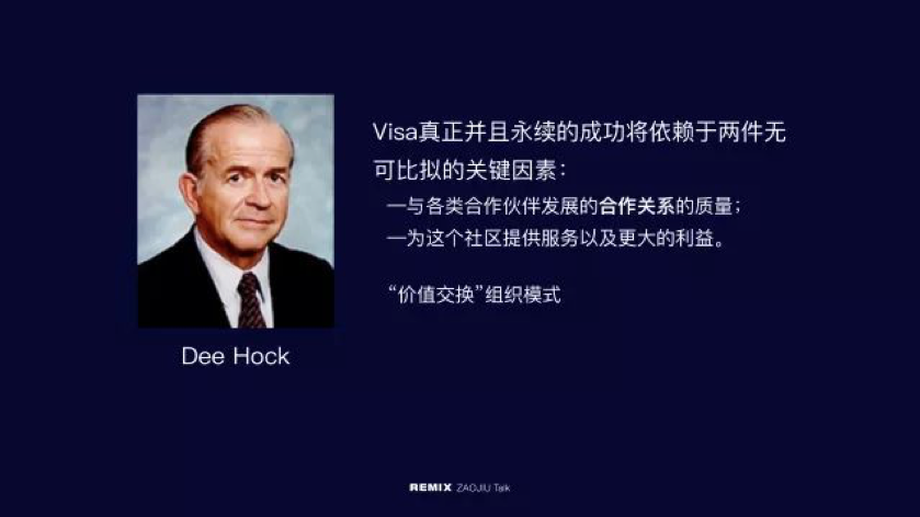 第二个人叫Dee Hock 。他是VISA的创始人,也是第一任总裁。当时情况非常混乱,大概有几十、上百家发行信用卡的银行或者金融机构在互相吵架,无法达成一致。