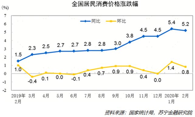 物价是老百姓关心的热点话题。中国2月CPI同比增长5.2%,略高于市场预期的4.9%。而1月份CPI达到5.4%,是8年多以来首次“破5”。2月份的CPI尽管有所下降,但依然破5,其背后的主要原因显然是受到2月爆发的新冠肺炎疫情的影响。