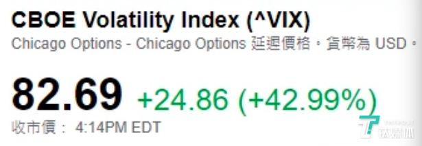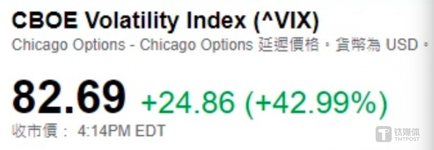 与此同时,用于衡量股市恐慌程度的芝加哥期权交易所波动率指数(VIX)飙升近25点,接近43%,收于82.69的创纪录高点,超过了2008年11月21日创下的80.74的峰值。这也代表着当前的恐慌指数,已经超过2008年金融危机时的峰值。