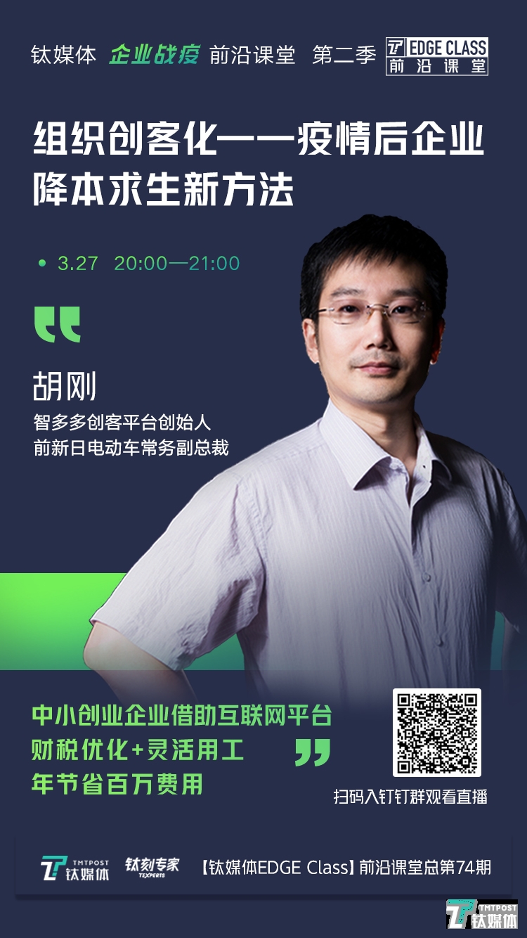 在以“'潜流'——疫情后的行业结构性变化与机会”为主题的钛媒体“企业战疫”前沿课堂第二季上,互联网财税专家胡刚将围绕:大平台+小创客模式,企业通过互联网平台财税优化+灵活用工一年节约500万元展开分享。