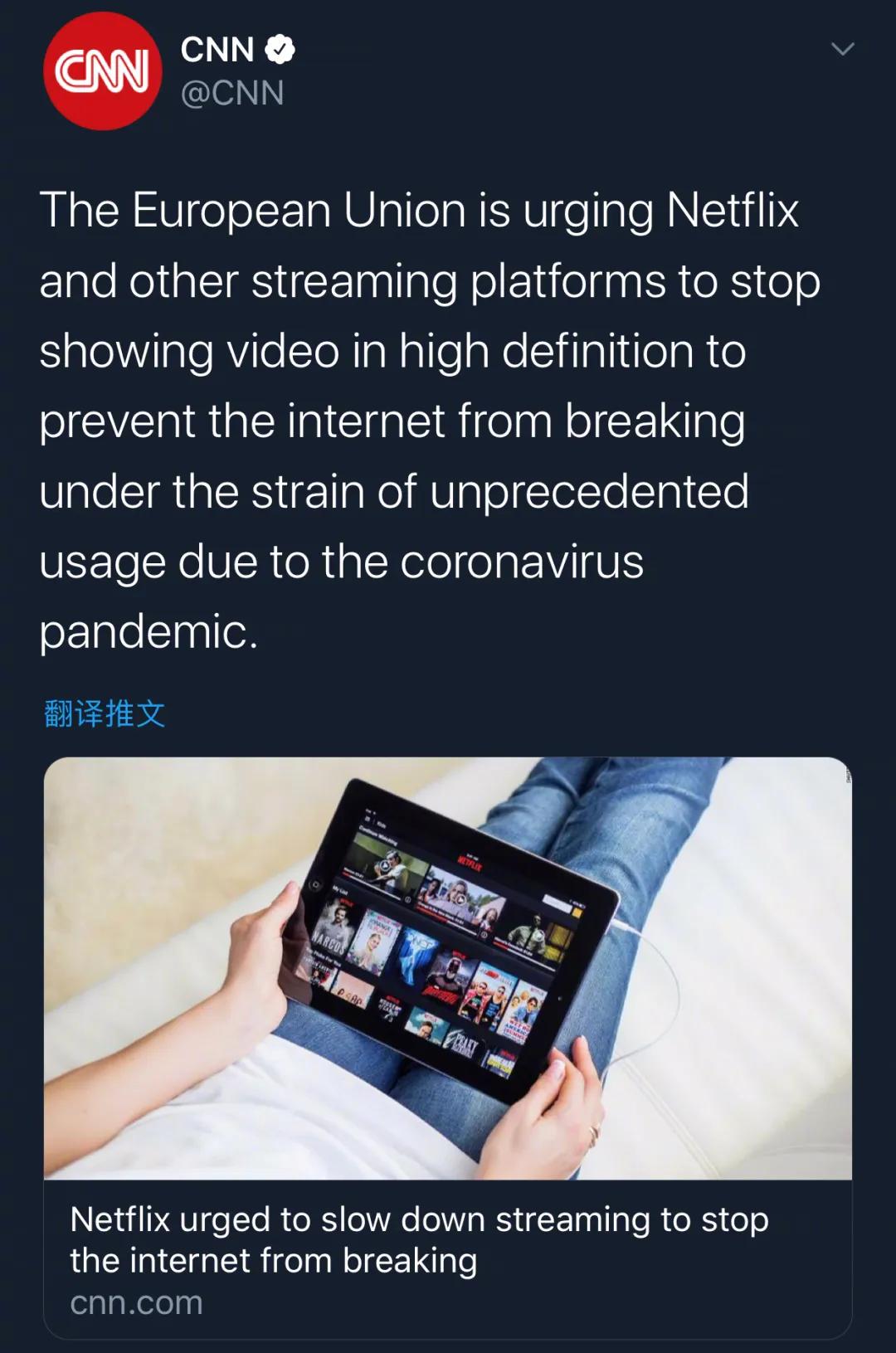 不久之前,有一则酷似“洋葱新闻”的趣闻引来许多网友调侃。因欧洲各国人民在家隔离期间都使用Netflix等流媒体平台观看剧集、电影,导致欧洲宽带不堪负荷。为此,有欧盟官员敦促运营商降低视频画质,节约带宽。目前,Netflix已作出在未来30天降低欧洲地区视频画质的决定。