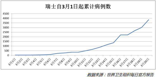 截至3月20日晚,瑞士累计确诊人数3863,累计死亡33例。对于国土面积不足45000平方公里、人口850万的瑞士来说,这一数字已对当地居民造成了恐慌。而随着周边国家如意大利、德国的疫情爆发,瑞士更是面临着巨大的防疫压力。